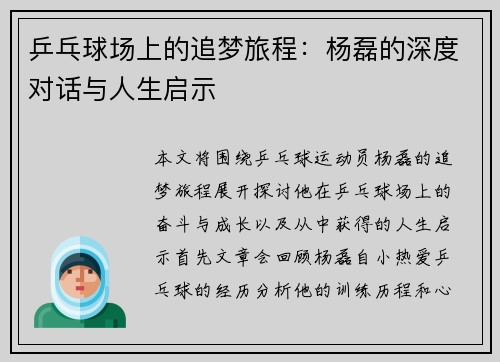 本文通过对乒乓球世界冠军张军的专访,深入探讨了他在乒乓球领域取得辉煌成就背后的秘密与成功秘诀。在这次访谈中,张军分享了他个人的成长历程、训练方法以及心理素质的重要性。此外,他还谈到了团队合作和教练指导在职业生涯中的关键作用。整篇文章分为四个主要部分,从不同角度分析了张军的成功之道,力图为读者揭示出乒...